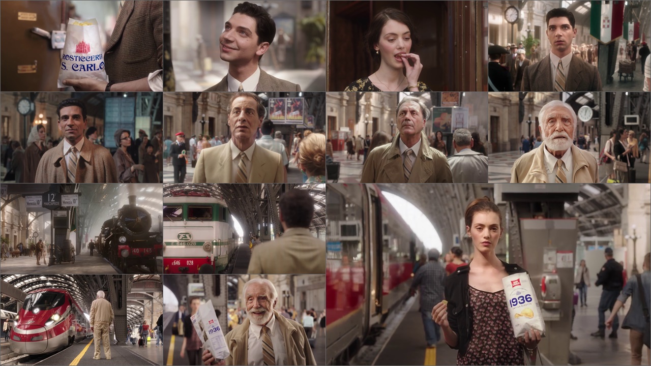 Lo spot inizia con una scena in bianco e nero di una grande stazione, la scritta in sovrimpressione ci informa che siamo nel 1936 a Milano. In sottofondo si ascolta la canzone “Tornerai” di D. Olivieri – N. Rastelli, interpretata da Carlo Buti. Il bianco e nero lascia spazio al colore e vediamo due giovani fidanzati che si salutano, lei prende il treno, lui ha in mano un pacchetto di patatine della Rosticceria S, Carlo che lei gli prende di mano quando il treno parte.