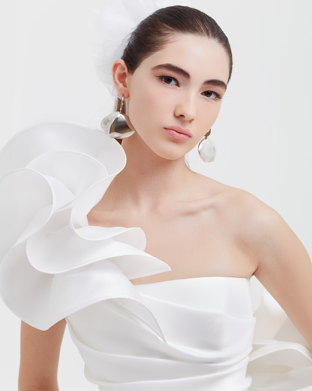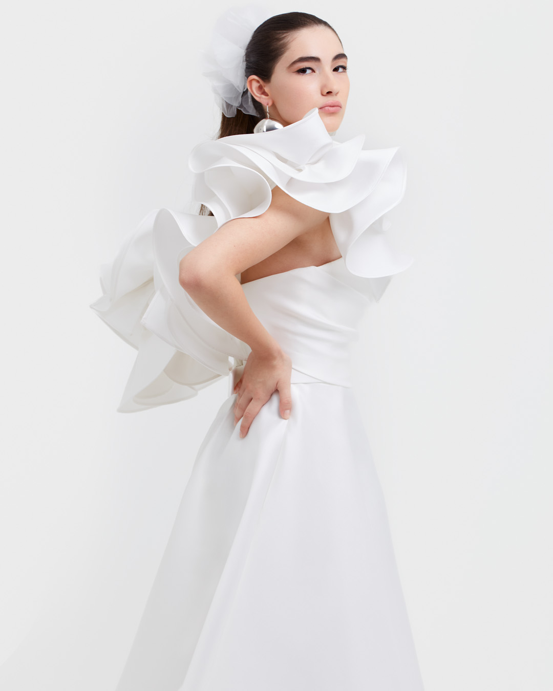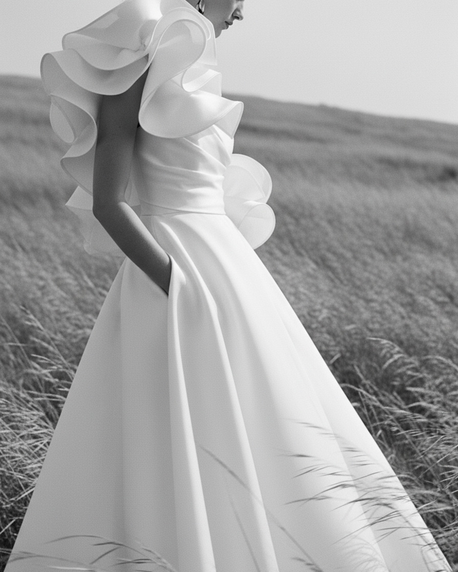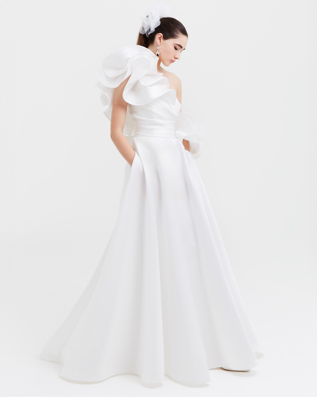 Abito da sposa in mikado di seta pura, dal design scultoreo e contemporaneo. Il corpino dal taglio décolleté è impreziosito da un volant staccabile, che consente di trasformare l’abito con versatilità. La gonna ampia e strutturata scende fluida con linee pulite ed eleganti, arricchita da tasche laterali che aggiungono modernità. Un modello che fonde sartorialità, innovazione e raffinatezza assoluta.