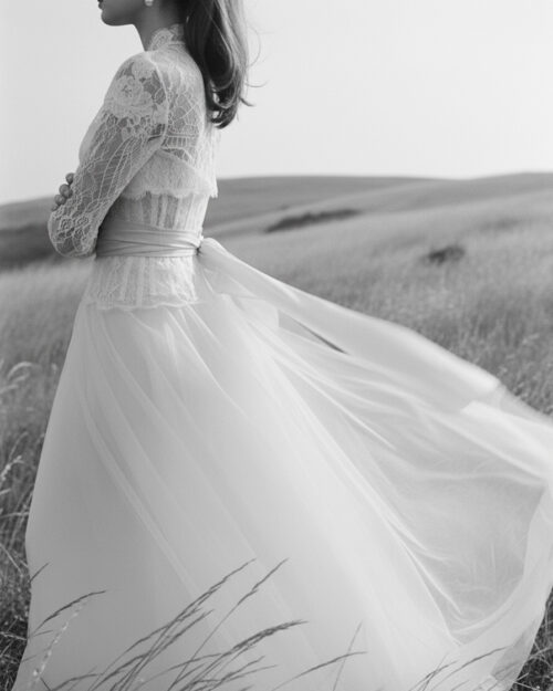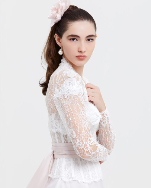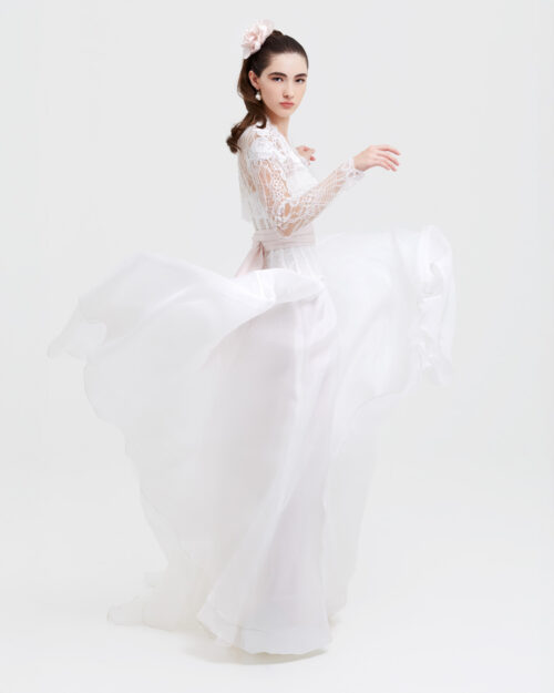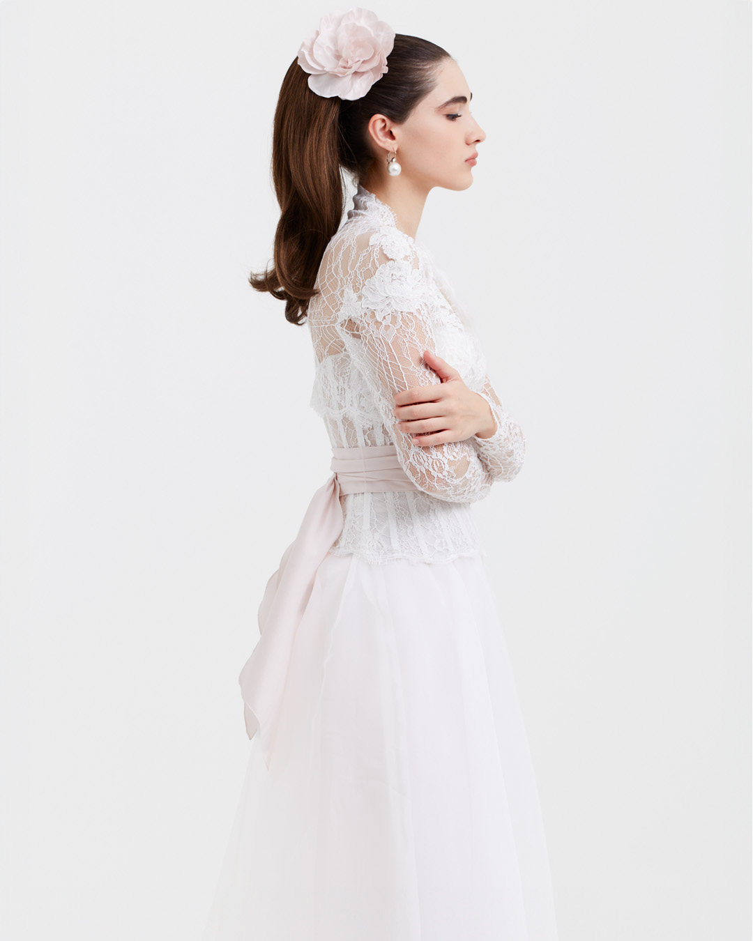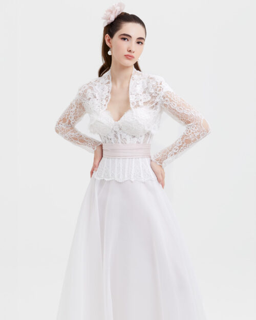 Abito da sposa dall’eleganza romantica e ricercata, composto da elementi staccabili che ne arricchiscono la versatilità. Il bolerino in pizzo francese rebrodé avvolge con raffinatezza le spalle e può essere rimosso per un look più essenziale. Il bustier, anch’esso in pizzo francese rebrodé, scolpisce la figura con grazia, mentre la cinta drappeggiata in mikado di seta rosa sottolinea il punto vita con un delicato tocco di colore. Completa l’insieme la gonna in organza di seta pura, fluida e leggera, che dona movimento e luminosità all’intera creazione.